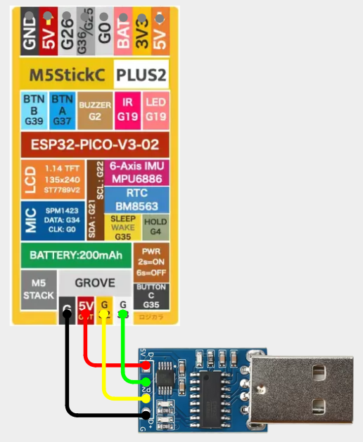 M5StickC - CH9329 USB HID# Items Needed# CH9329 Pins# CH9329 M5StickC 5V - 1 5V TX - 2 G33 RX - 3 G32 GND - 4 GND Wiring Diagram# View on Cirkit Designer