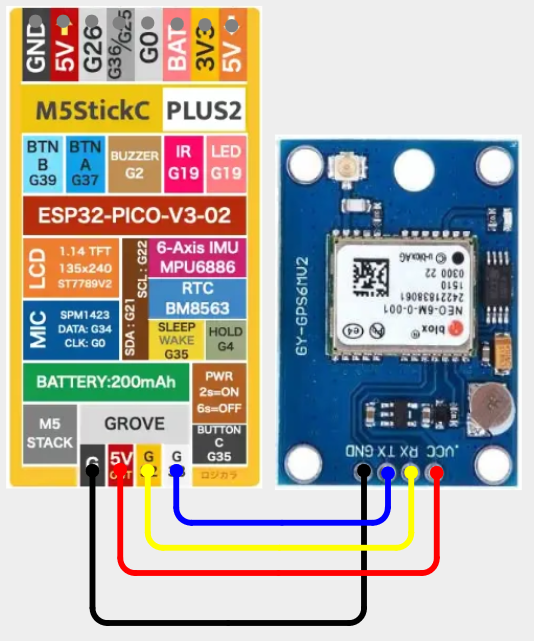 M5StickC - GPS# Configuration# More information GPS modules can be found here. Default Pins: RX=33 TX=32 Items Needed# GPS Module Pins# GPS M5StickC VCC/5V - 1 5V RX - 2 G32 TX - 3 G33 GND - 4 GND Wiring Diagram# View on Cirkit Designer