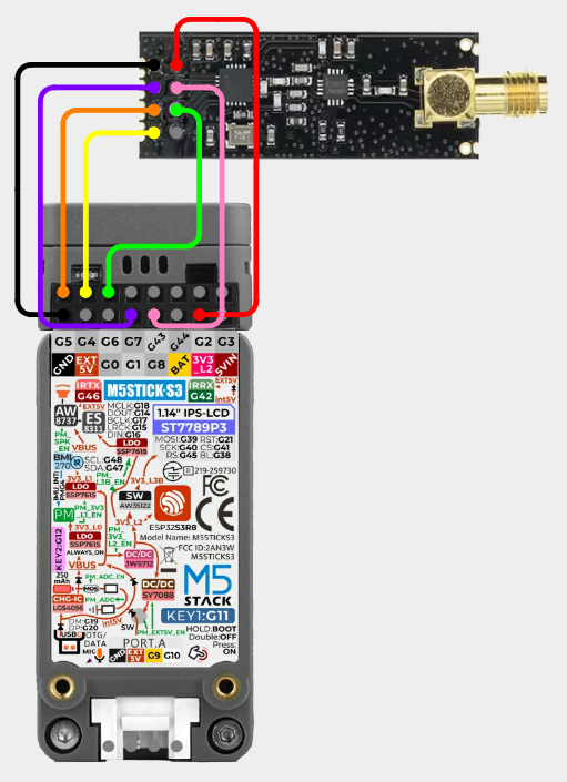 M5StickS3 - NRF24# Items Needed# NRF24 Pins# NRF24 M5StickS3 GND - 1 GND VCC - 2 3V3 GDO0 - 3 G7 CSN - 4 G8 SCK - 5 G5 MOSI - 6 G6 MISO/GDO1 - 7 G4 DGO2 - 8 Not Connected Wiring Diagram# View on Cirkit Designer